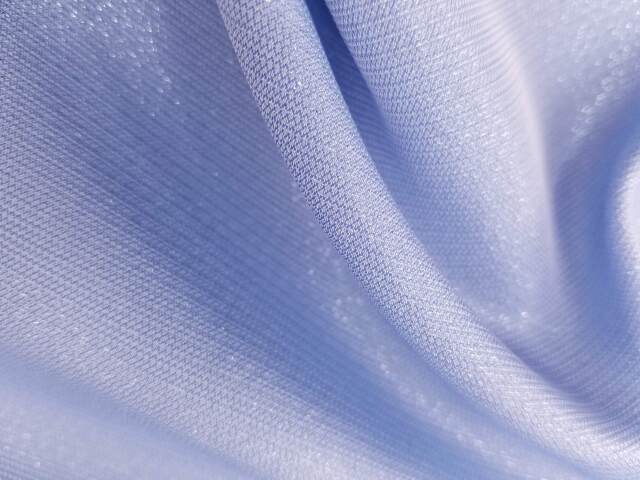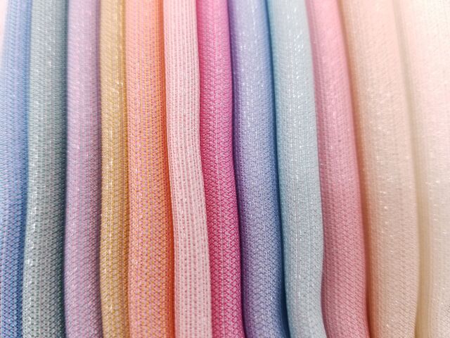 組織を横畝にし、ラメの輝きが単調にならないように横糸とラメの色に差をつけ陰影をつけることにより色の深みと輝きを引き出しました。