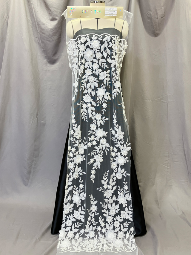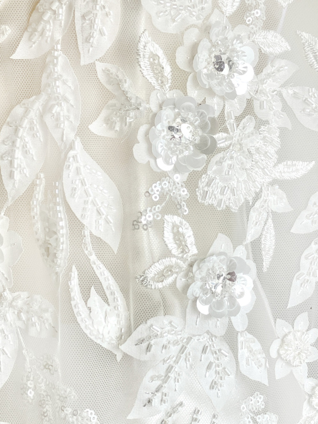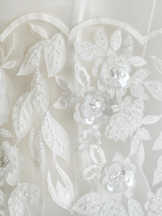 花の茎や葉脈は、繊細な刺繍糸や穴の開いた小さなスパンコールで表現し、不織布やビーズ、スパンコールを重ねて花の立体感を演出した贅沢なレース。両サイドには美しいスカラップがあしらわれ、左右対称のような整ったパターンが気品と華やかさを与えます。