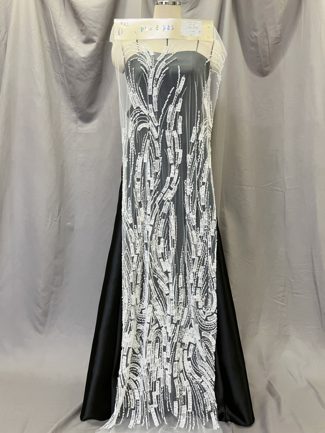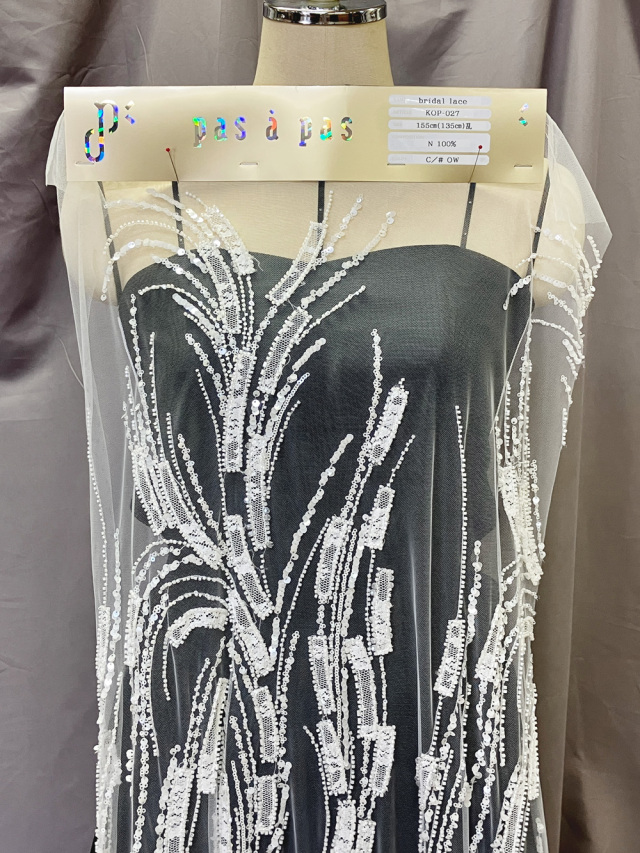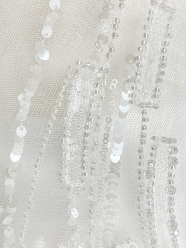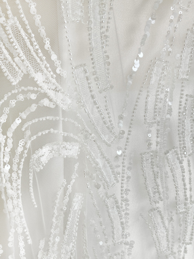 繊細でモダンな曲線が美しく広がるレース生地です。花や葉などの具象的なモチーフは使わず、あえて形のない美しさを表現したデザインは、洗練された感性を持つ花嫁様にもおすすめです。