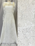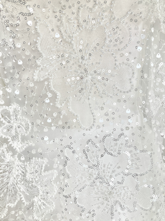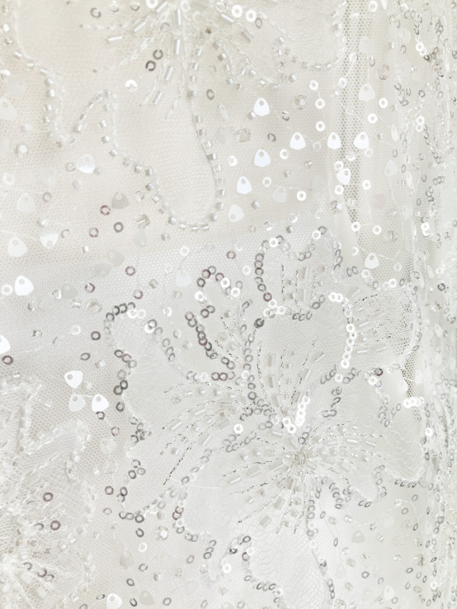 柄と柄の隙間にも施された繊細な刺繍の輝きが高級感を与えます。クラッシックなドレスにもモダンなスタイルにも合わせやすそうです。