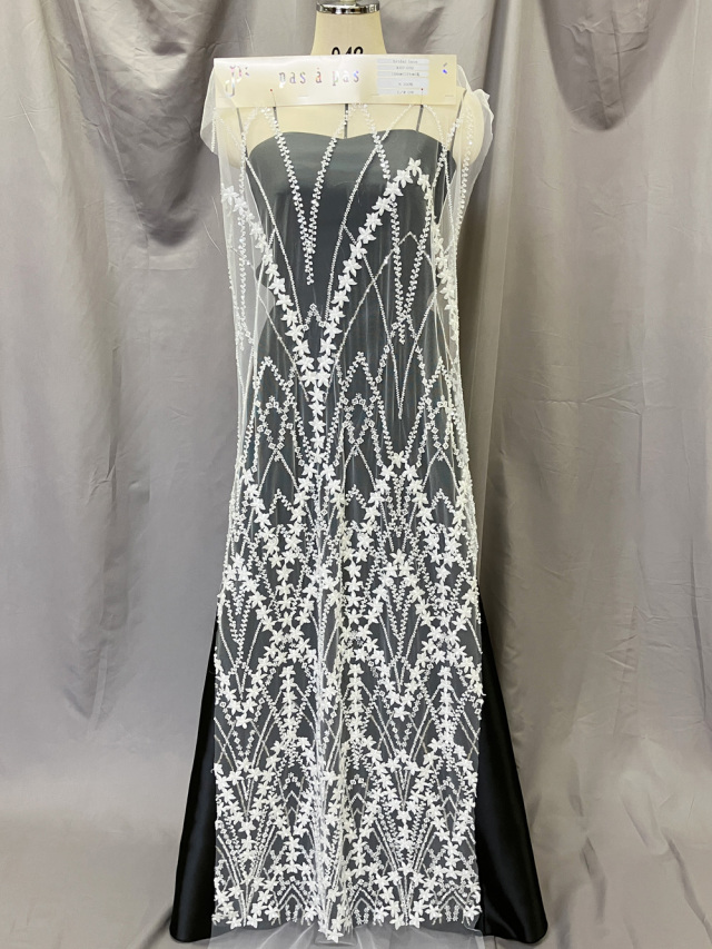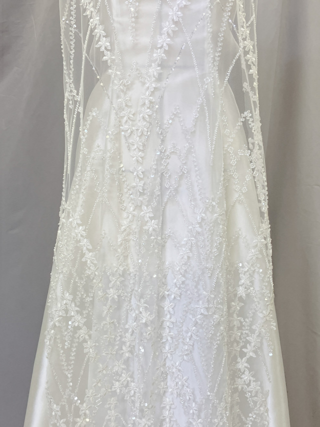 裾にかけて徐々に広がるアーチ状の刺繍と、可憐な小花がリズミカルに咲き並ぶ、上品でクラシカルな洗練されたレースです。