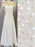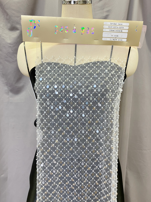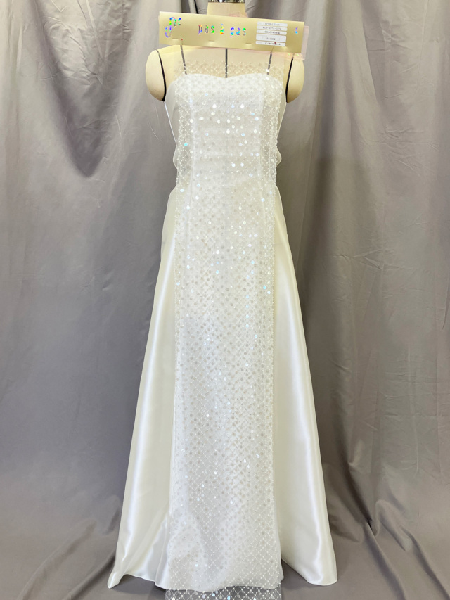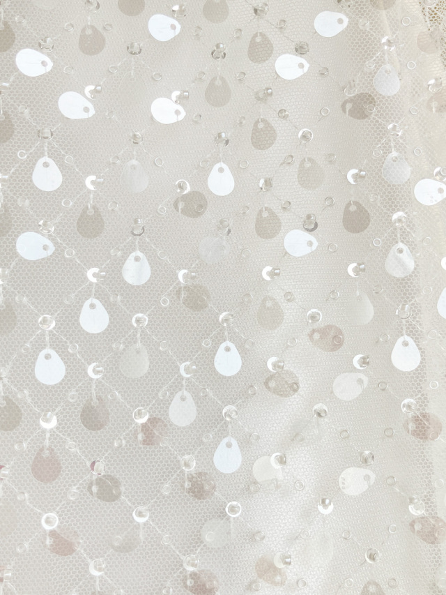 繊細な小粒のビーズで丁寧に組まれた格子模様が美しいレース。さりげなく光を反射するスパンコールが加わり、動きに合わせてきらめく華やかさを演出します。