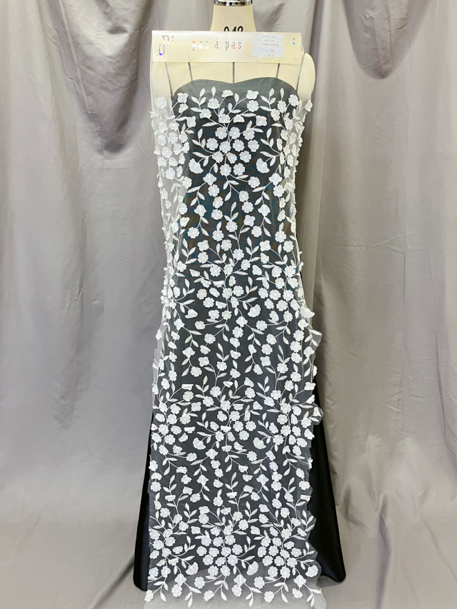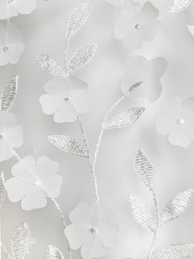ふんわりと咲き誇る小花が愛らしい、ロマンチックなレース。花びらには、シフォン特有の軽やかさに少しだけ張りを加えた素材を使用し、ふんわりと優しい立体感を生み出しています。可憐でナチュラルな印象があり、インスタグラムでも人気を集めたレースです。