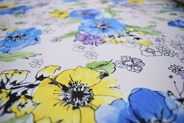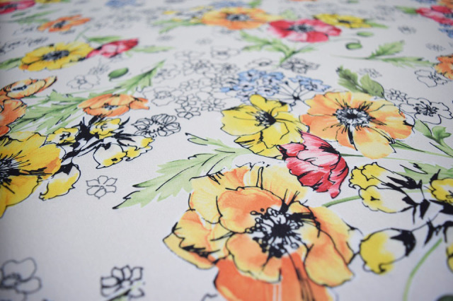 アイボリー地にモノトーン調のタッチで散りばめた小花とイエロー・レッド・オレンジの暖色系の花をミックスし、ほのかなアイスランドブルーの小花を効かせました。C/#P3のネイビー地とベース色違いです。