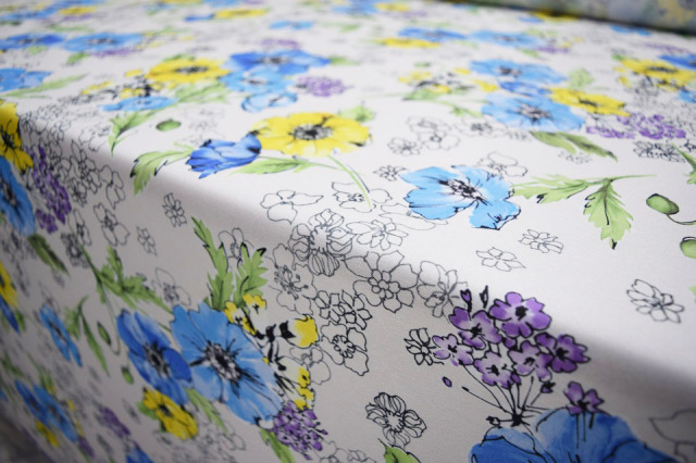 アイボリー地にモノトーン調のタッチで散りばめた小花と味のある2色のブルーにレモンイエローを効かせバイオレットの小花をミックスしました。