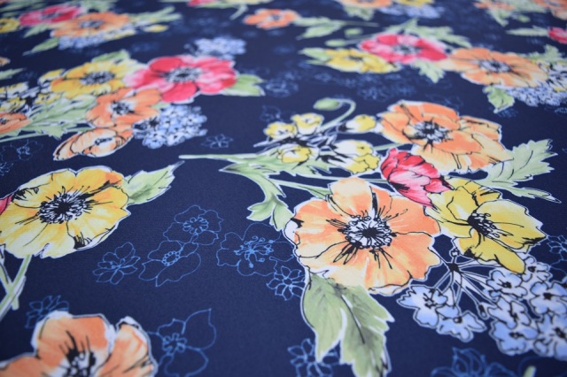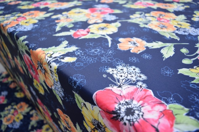 ネイビー地にアクアグレーで散りばめた小花と、イエロー、オレンジ、レッドの暖色系の花をミックスし、ほのかなアイスランドブルーの小花を効かせました。C/#P1のアイボリー地とベース色違いです。